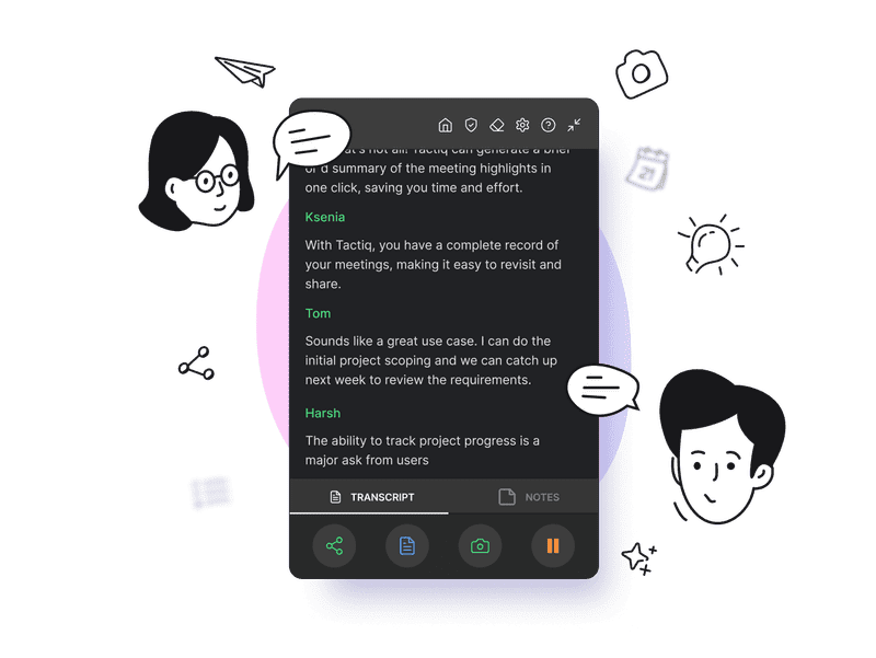 您还可以使用Tactiq的AI转录工具在会议期间体验实时转录,这样您就不需要手动做笔记了!