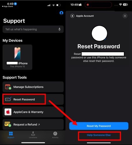 步骤1。在借用的手机上打开 Apple 支持 App,然后轻点重置密码开始吧。
