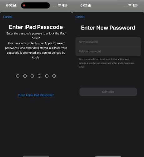 步骤 4。现在,您将看到与 appleid.apple.com 上的密码重置屏幕类似的屏幕,但有一个关键区别:无需输入当前密码。只需创建一个新的,确认它,然后点击继续。