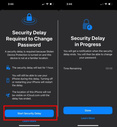 笔记:如果“查找我的 iPhone”已打开,Apple 会显示“更改密码需要安全延迟”的屏幕来暂停您。此延迟旨在阻止任何人仅仅因为知道您的密码而快速重置密码。