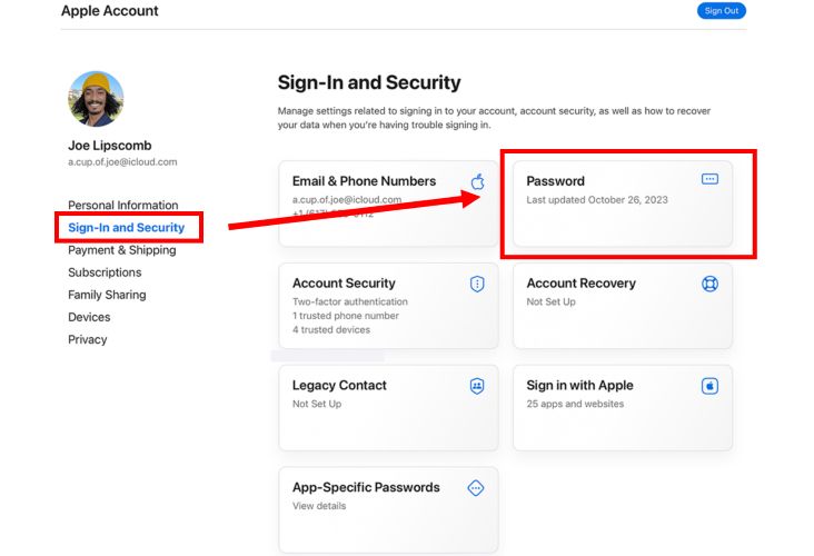 步骤 4。成功登录后,您的 Apple 帐户仪表板将会出现。在左侧,选择登录和安全。然后,单击密码卡片。