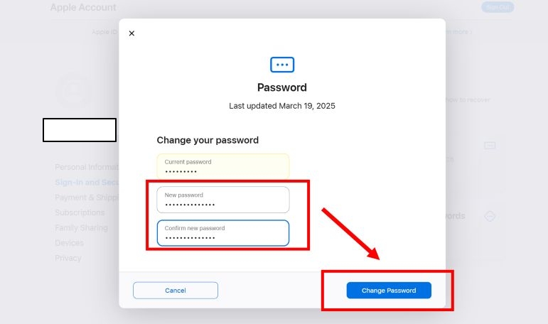 步骤 4。现在输入新的 Apple ID 密码,在第二个字段中确认,然后单击改变完成该过程。