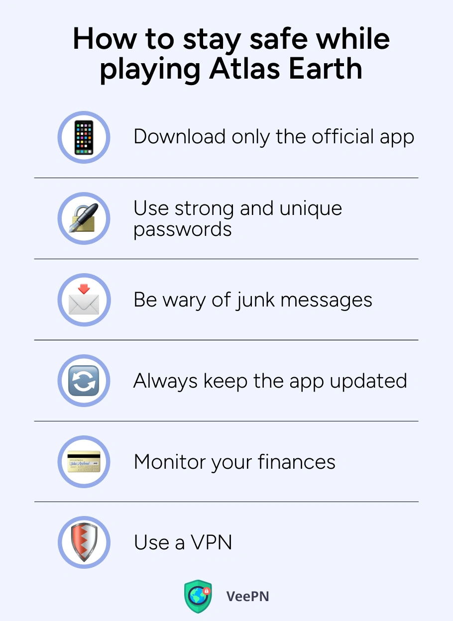 尽管 Atlas Earth 并不是彻头彻尾的骗局,但最好还是遵循这些方法来保护您的游戏体验、财务数据和隐私。