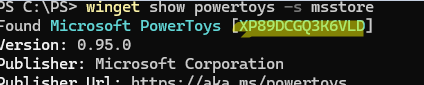 Microsoft Store 应用程序可以通过其应用程序 ID 安装/删除。例如,要获取 PowerToys 应用程序 ID,请运行: