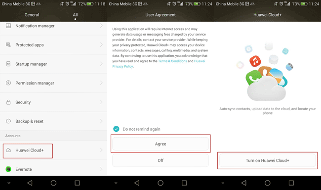 现在我们来看看该功能在华为安卓手机(华为荣耀6+)上的使用情况。请按照以下步骤在您的 Android 帐户上设置 Google Cloud 备份。