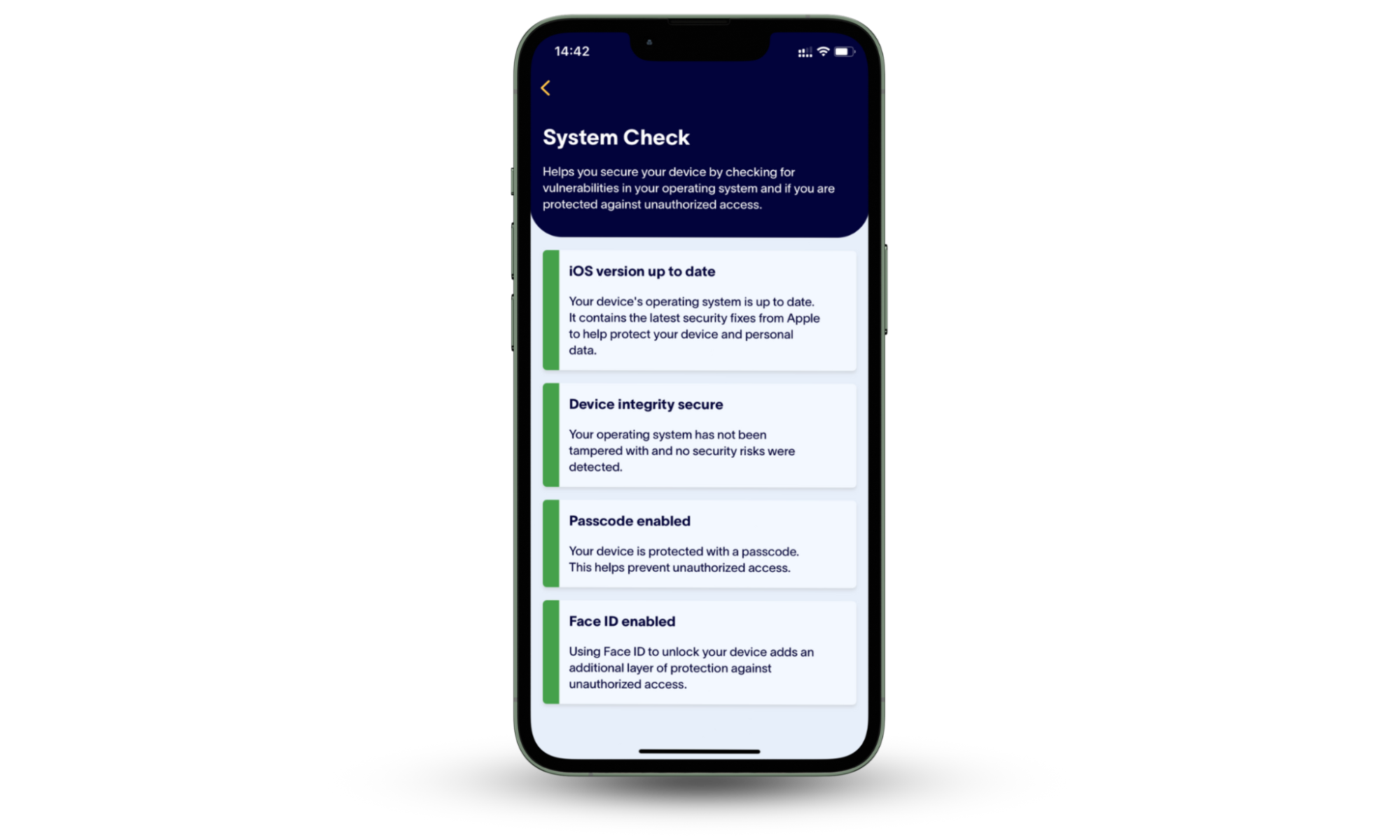 - 设备系统检查会扫描您的 iPhone 是否有越狱或可能表明安全威胁的危险系统更改。