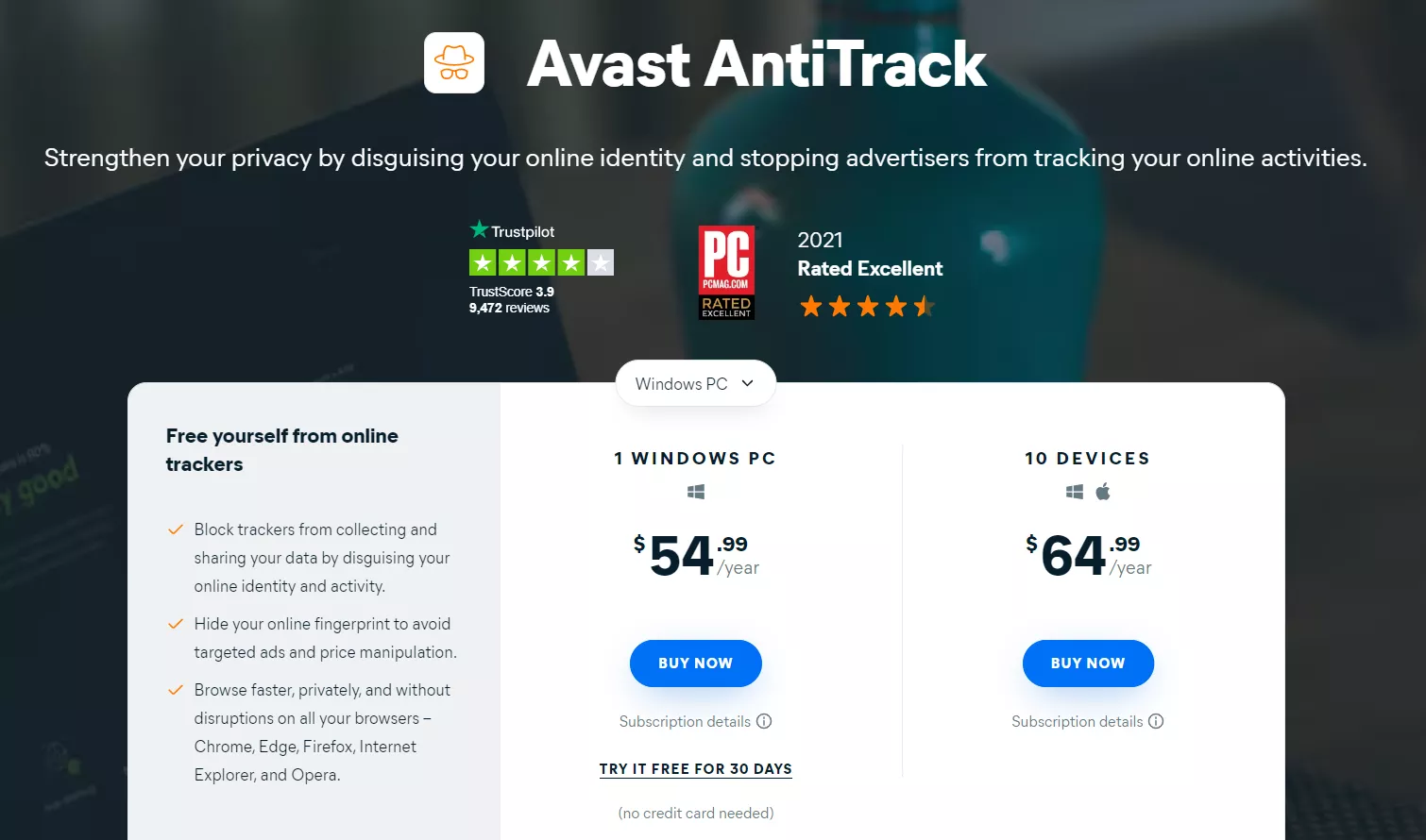 Avast AntiTrack 不是免费服务,但您可以在加入其付费计划之前获得 30 天免费试用(无需信用卡)。