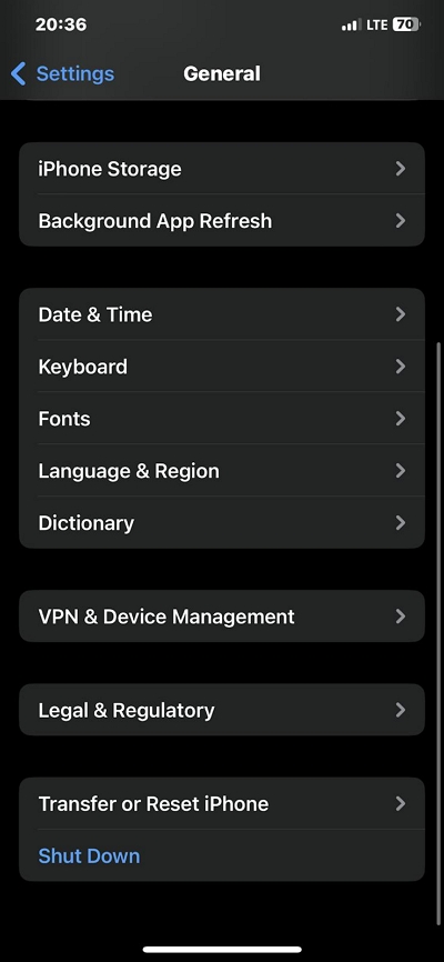 步骤2:向下滚动找到“传输或重置 iPhone”并点击它。