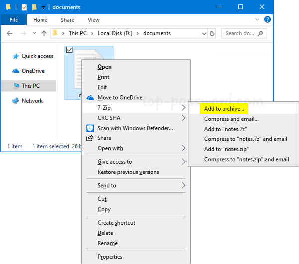 - 安装后,在 Windows 资源管理器中右键单击记事本文本文件,然后选择7-拉链->添加到存档选项。