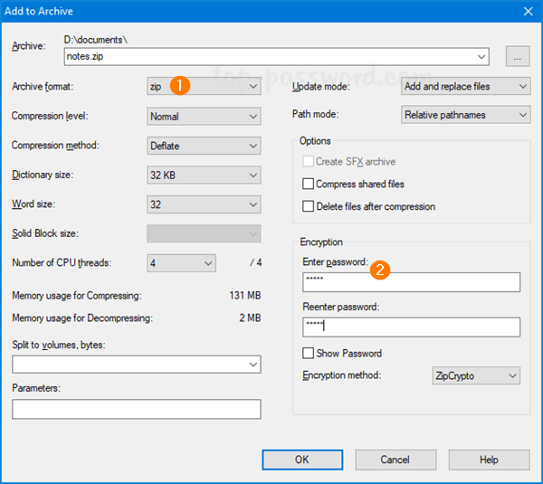 - 当弹出“添加到存档”窗口时,将存档格式更改为 Zip 并输入保护文本文件的密码,然后单击好的。