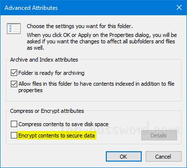 - 在常规选项卡上,单击先进的。接下来,选中“加密内容以保护数据”并点击好的。