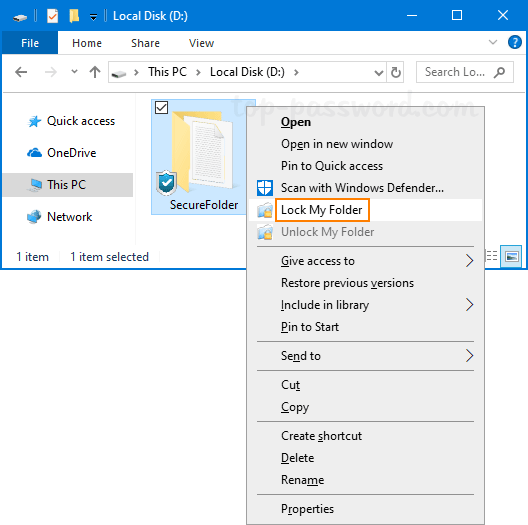 - 处理完文本文件后,您可以锁定安全文件夹以防止其被访问。只需右键单击 Windows 资源管理器中的安全文件夹并选择“锁定我的文件夹“。此外,系统重新启动或关闭会将您的安全文件夹自动置于锁定状态。