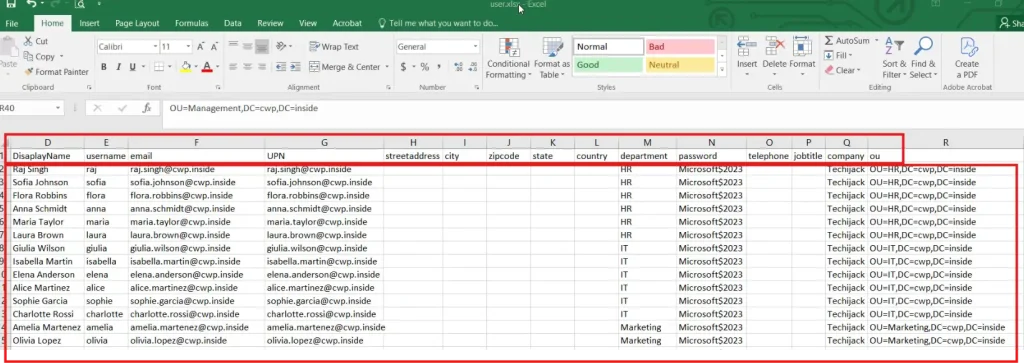 然后用所需的名称、其他属性(例如部门和 OU)填充此 Excel 文件。