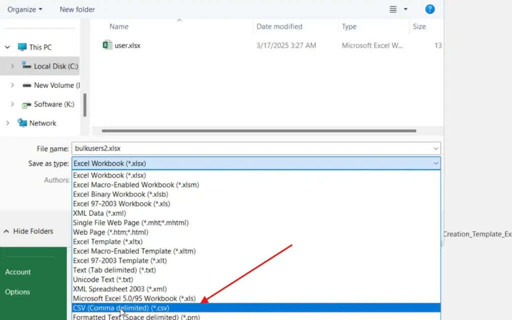 在我们的例子中,我们将其放置在位置 c:tempbulkusers.csv