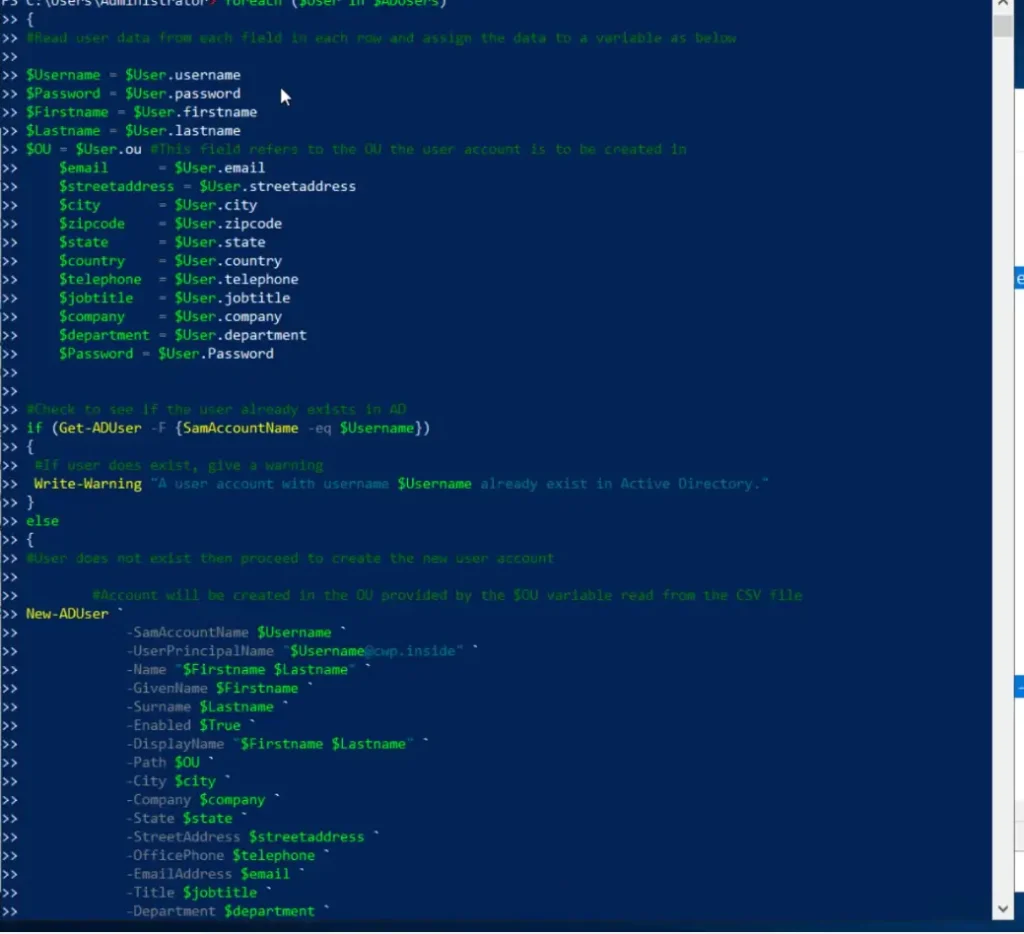 $ADUsers = Import-csv C:tempbulkusers.csv