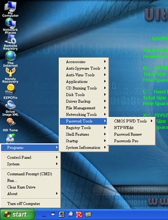 - 完全加载需要几分钟的时间,但是当加载完毕后,您应该会看到类似 Windows XP 的界面。到达那里后,转至开始 > 程序 > 密码工具 > NTPWEdit。