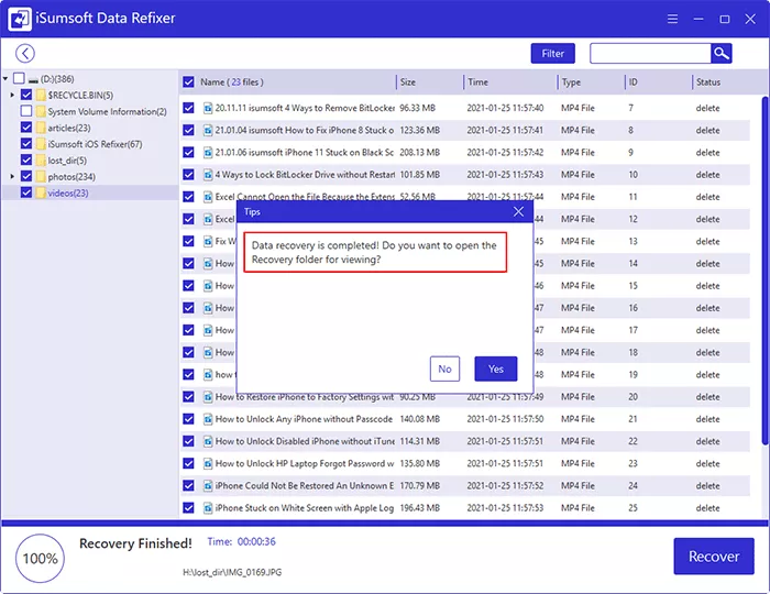 打开恢复文件夹以查看恢复的文件。单击是,您可以立即访问