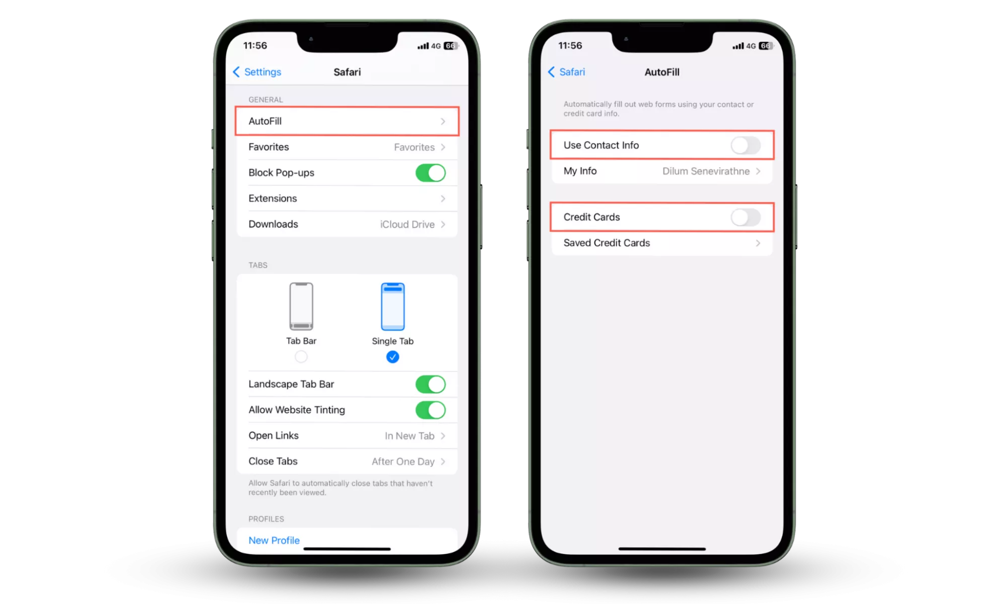 步骤 1-3:转到“设置”>“Safari”>“自动填充”,然后禁用“使用联系信息”和“信用卡”开关。