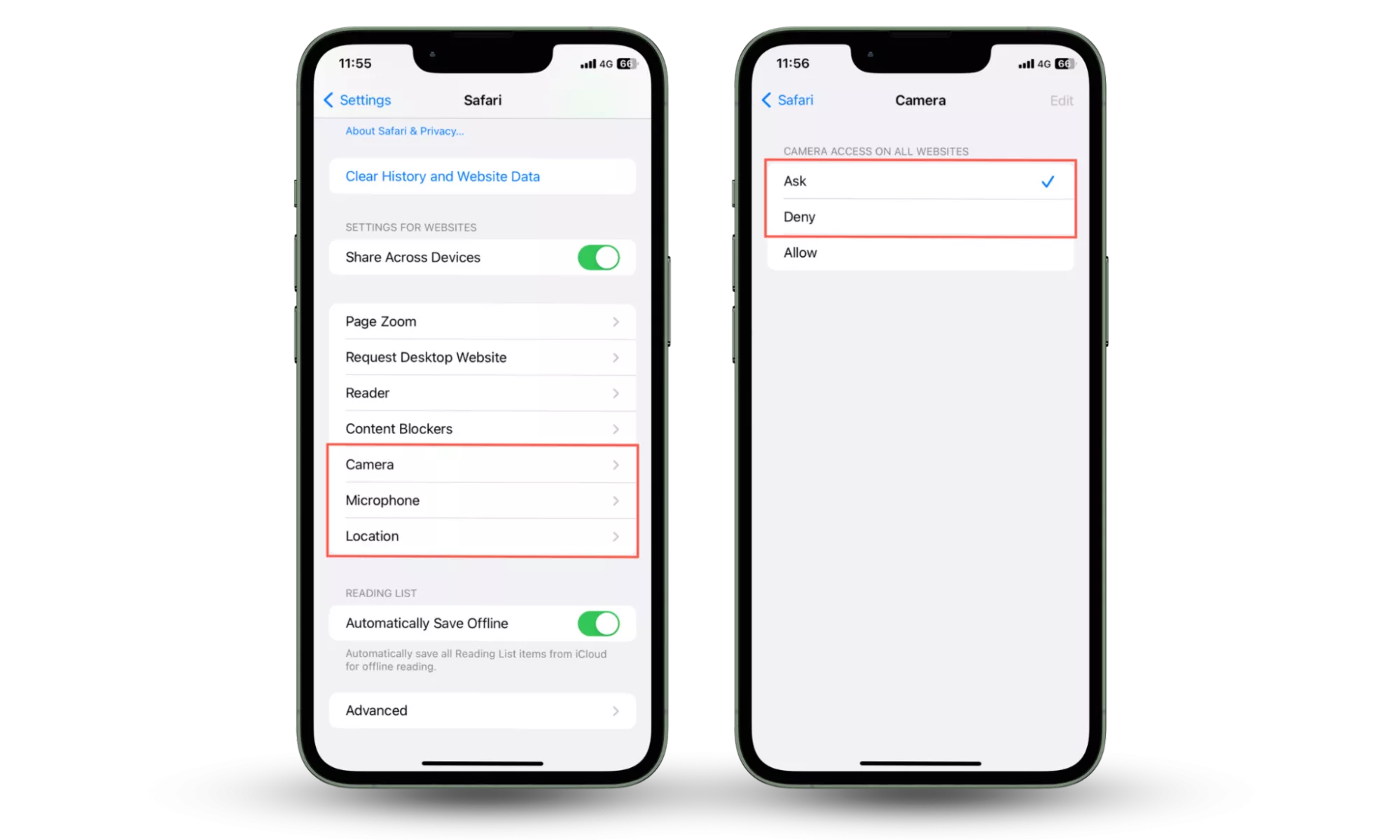 步骤 1-3:转到“设置”>“Safari”,然后将“相机”、“麦克风”和“位置”权限设置为“询问”或“拒绝”。