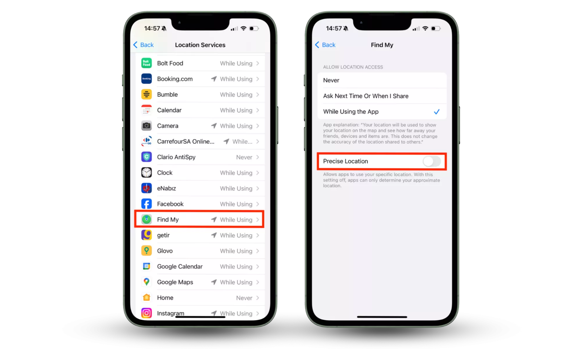 步骤 3-5:点击“查找我”,然后点击“从不”或关闭“精确位置”来禁用位置访问。