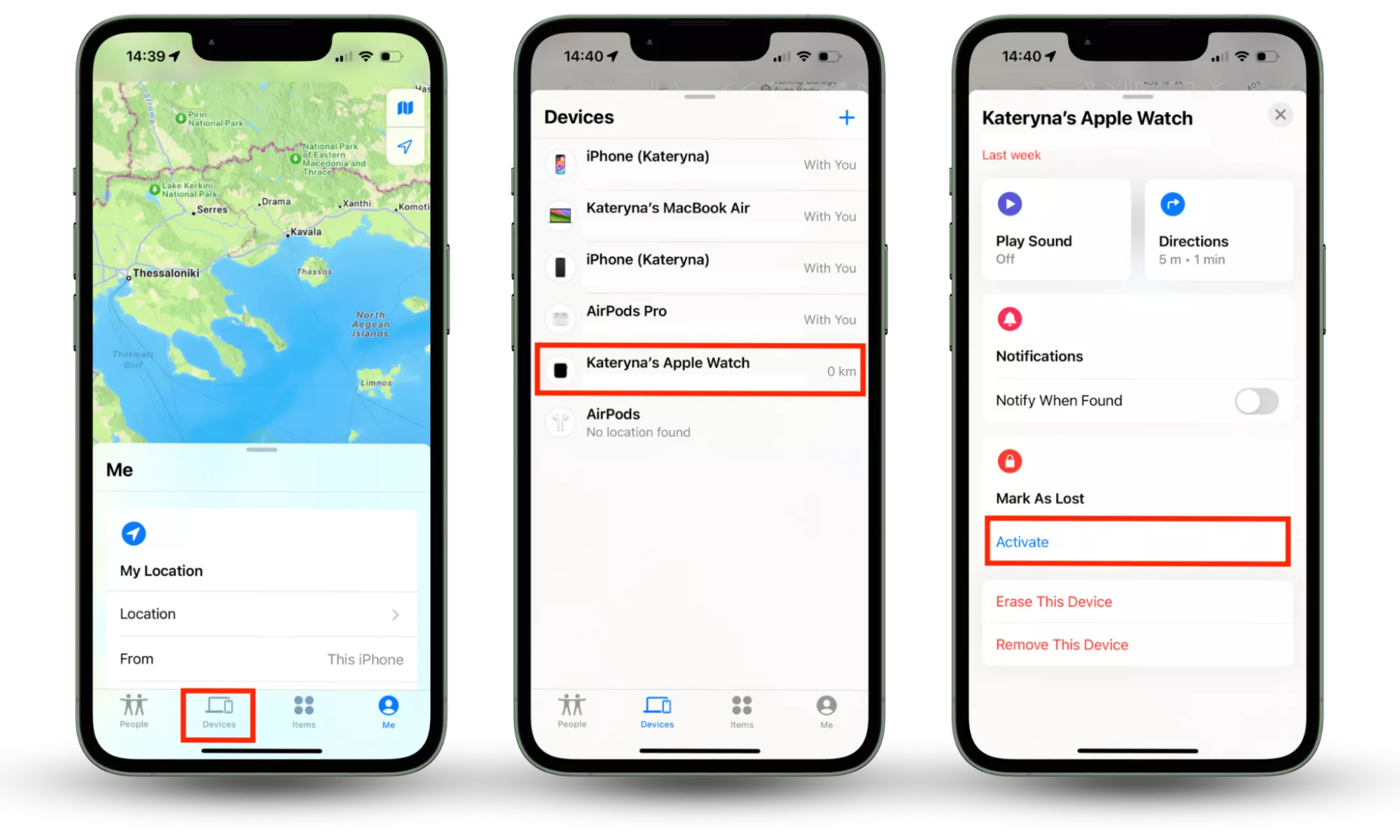 步骤 1-3:在“查找我的应用程序”中打开“设备”> 选择“Apple Watch”> 点击“激活”。