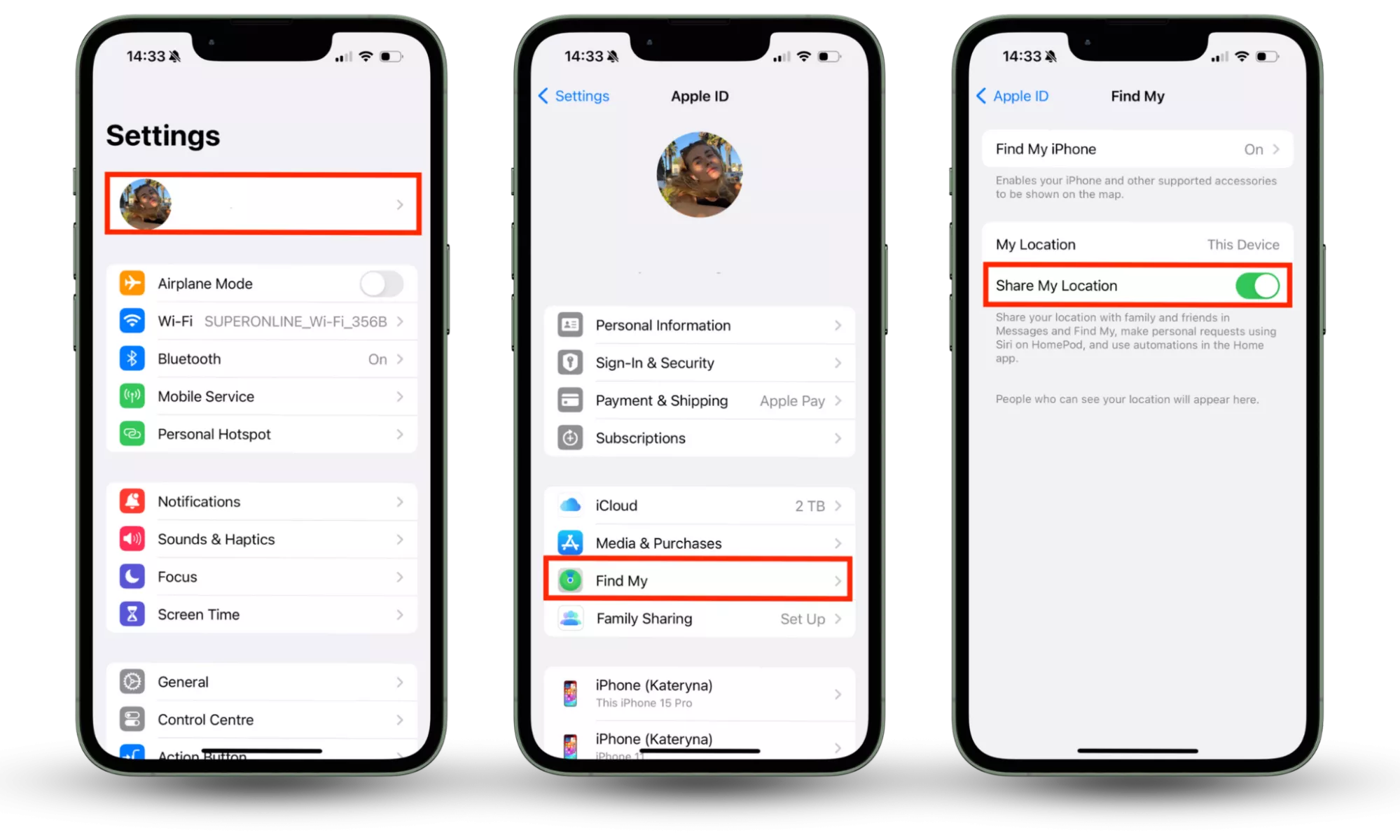 步骤 2-5:从设置中的个人资料图片 > 点击“查找我的”>“关闭共享我的位置”或点击“停止共享我的位置”。