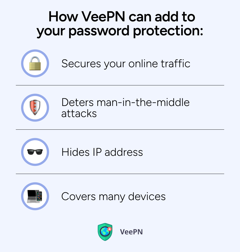 使用密码管理器是提高安全性的一大进步,但如果没有 VPN,您的凭据仍然可能在传输过程中暴露。这就是 VeePN 可以为您的密码管理器保护添加的功能: