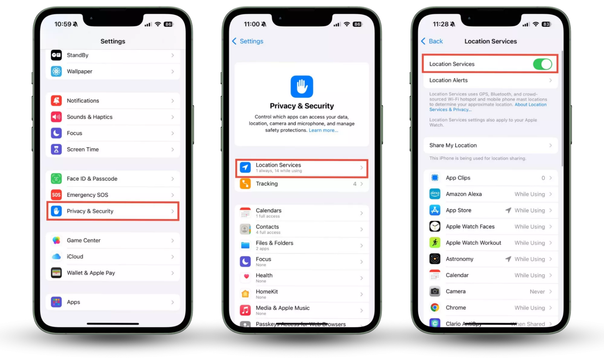 步骤 1-3:设置 > 隐私和安全 > 定位服务 > 进行必要的更改