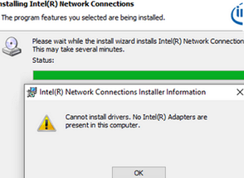 Intel(R) Network Connections Installer Information Cannot install drivers. No Intel(R) Adapters are present in this computer. No Intel Network Connections found on this computer. No drivers were installed.
