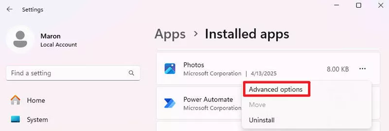2。滚动浏览已安装的应用程序列表,直到找到照片应用程序,然后单击右侧或应用程序的三个点,然后选择高级选项。