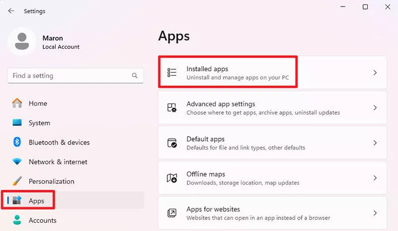 1。按Windows键 + I打开设置应用程序,然后选择应用程序,然后单击已安装的应用程序。