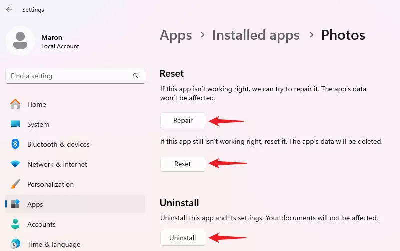 3。点击维修。这将尝试解决该应用程序的任何问题。修复后,尝试再次打开PNG文件。
