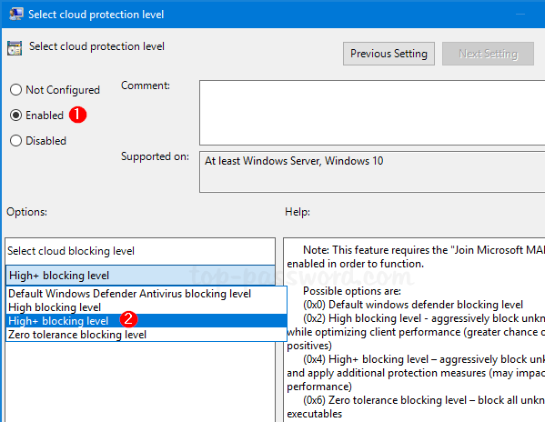 - 选择启用然后拿起“高+阻断水平”选项可提高 Windows 10 计算机上的云保护级别。