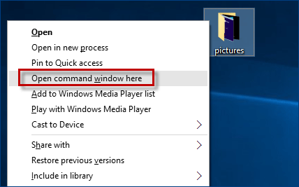 步骤 1:找到该文件。按住鼠标右键单击该文件转移键,然后选择在这里打开命令窗口从上下文菜单。这将打开一个 CMD 窗口。