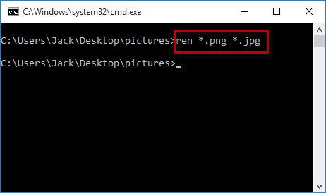 例如,就我而言,我使用任*.png *.jpg命令更改所有图片文件的扩展名.png到.jpg,如下图所示。