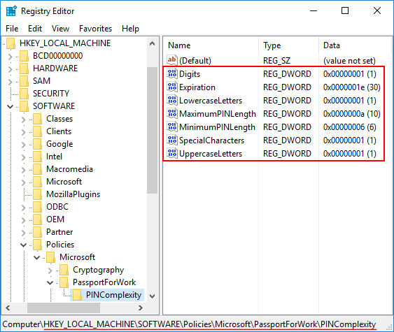 - 如果您不想强制执行其中一项 PIN 复杂性策略,只需删除相应的 DWORD 值即可。完成注册表编辑后,重新启动 Windows 10 以应用新的 PIN 复杂性策略。