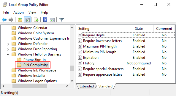 Computer Configuration > Administrative Templates > Windows Components > Windows Hello for Business > PIN Complexity - 在右侧,您可以看到 8 种不同的策略来自定义 PIN 复杂性。请注意,更改 PIN 复杂性不会影响现有 PIN 登录,只会影响创建的新 PIN。