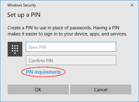 - 设置完 PIN 复杂性后,重新启动 Windows 10 以使更改生效。现在,当您尝试设置新的 PIN 码时,您可以看到“PIN 码要求” PIN 框下方的链接。单击该链接,您可以查看计算机上配置的 PIN 复杂性要求。