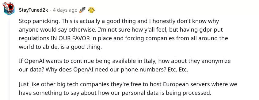 由于ChatGPT因数据隐私相关问题(包括3月20日发生的数据泄露事件)在意大利被禁止,其他欧洲国家也可以做出同样的决定。这是因为它们具有相同的客户数据保护法,例如 GDPR。查看这篇文章以了解更多信息。