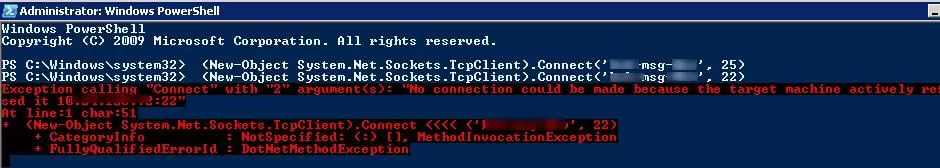 (New-Object System.Net.Sockets.TcpClient).Connect('ny-msg01', 25)