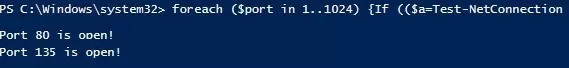 foreach ($port in 1..1024) {If (($a=Test-NetConnection srvfs01 -Port $port -WarningAction SilentlyContinue).tcpTestSucceeded -eq $true){ "TCP port $port is open!"}}