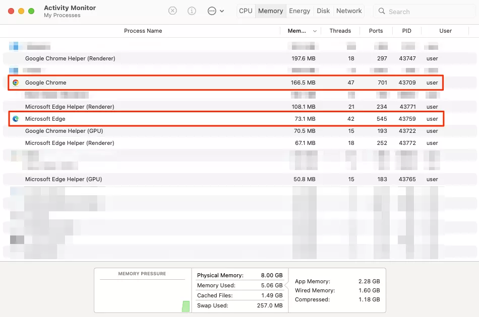 更具体地说,我们在 macOS 设备上的活动监视器中测试了这两种浏览器的 RAM 消耗强度。这是我们的实验结果: