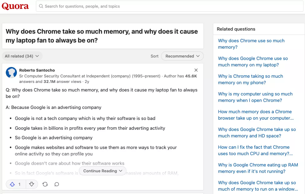 至于内存消耗,谷歌浏览器传统上被认为是最“消耗内存”的浏览器之一。论坛和 Quora 等社交网络上的许多投诉证明了这一说法:
