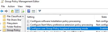 - 启用选项配置用户组策略环回处理方式。这是将“用户”部分的设置应用到计算机所必需的;