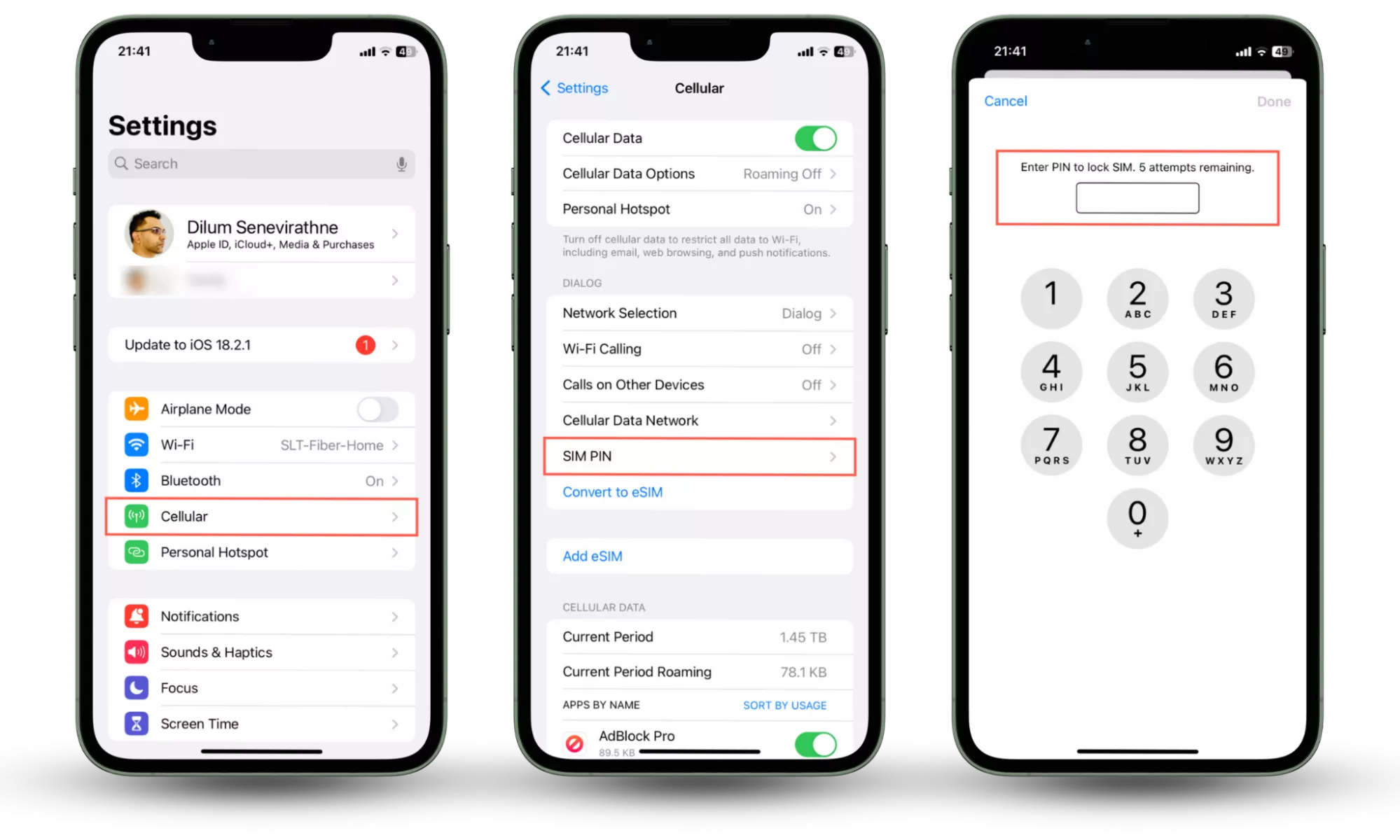 步骤 1-3:转至“设置”>“蜂窝网络”>“SIM 卡 PIN 码”,使用 PIN 码保护您的 SIM 卡。