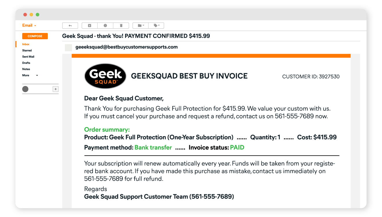 敏感信息请求:Geek Squad 永远不会通过电子邮件询问您的帐户密码、付款信息或其他敏感个人数据,这意味着对这些详细信息的任何请求都可能是诈骗的一部分。
