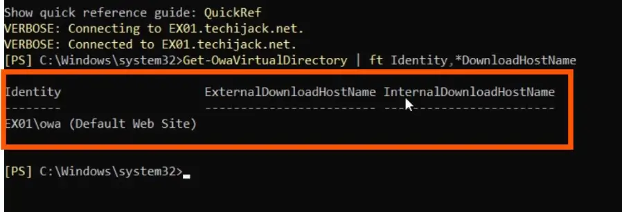 [PS] C:Windowssystem32>Set-OwaVirtualDirectory -Identity "EX01owa (Default Web site)" -InternalDownloadHostName "attachment.mail.techijack.net"