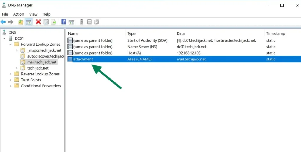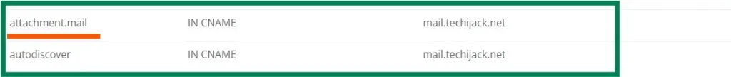 下图显示了我们的 CNAME 记录依恋指向内部 DNS 中的 mail.techijack.net 区域。