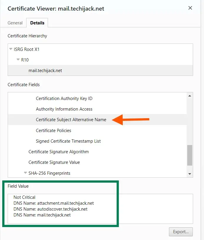 下图显示了为下载域attachment.mail.techijack.net配置的SAN证书