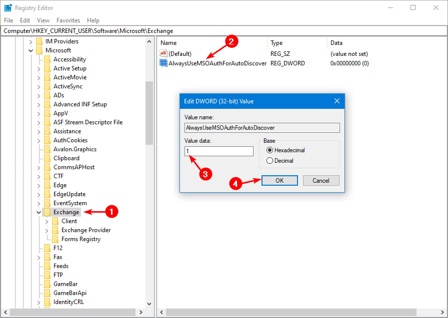 HKEY_CURRENT_USERSoftwareMicrosoftExchangeAlwaysUseMSOAuthForAutoDiscover